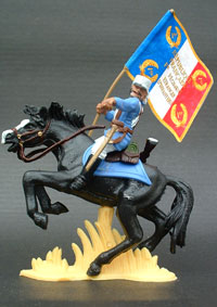 Introduction In these pages we are offering flags for use with all the 54 and 60 mm figures. All the flags are computed generated, highly detailed and historically accurate, in the most of the cases we use photos of the real flags for made them or they are based in flags appeared in books, made in 266 dpi, texturized, full colour printed with laser color, in high quality paper. There are regimental flags and guidons of the american civil war, confederate and union flags, flags used in the colonial wars and the american indian wars, napoleonics flags, etc. All our flags have a height of 3 cms and the proportional width depending on the flag type, the guidones has a height of 1,3 cms. If you need a flag that is not available, send us all the information that you have and we made it for you. If you see some flag with mistakes, please e-mail us. The flag images in the pages are in normal resolution and are only for you have an idea of the flags. |